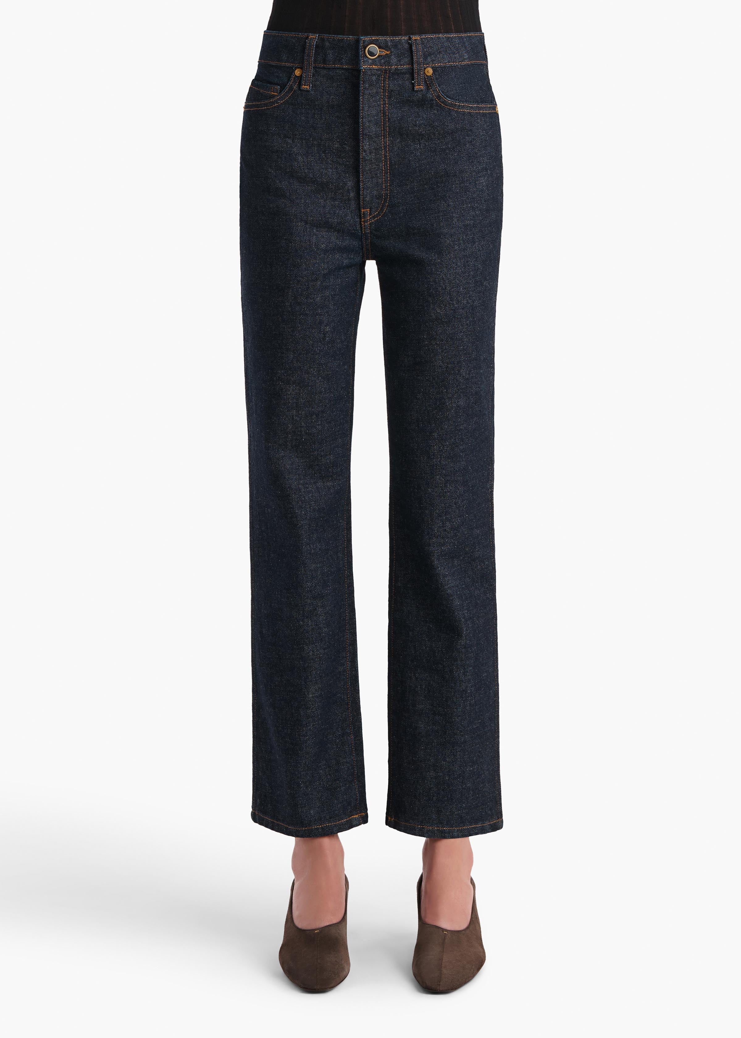 A cropped length balances a high rise, creating fresh and flattering proportions with classic straight-leg styling, marigold topstitching, and hand finishing.