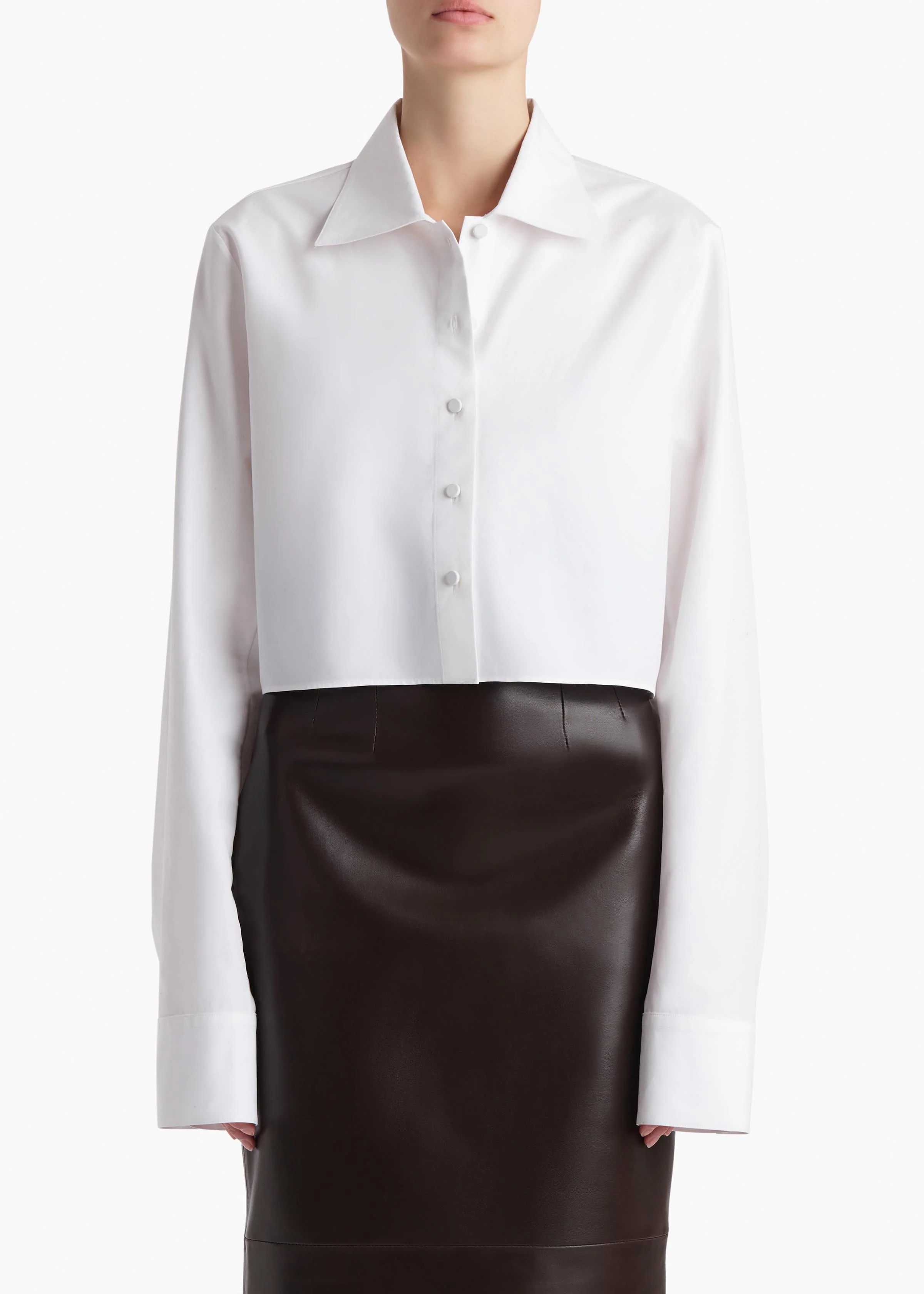 An outerwear-inspired button-up designed for a more straight and open fit. Shrunken cuffs and covered buttons at the placket and single-button cuffs.