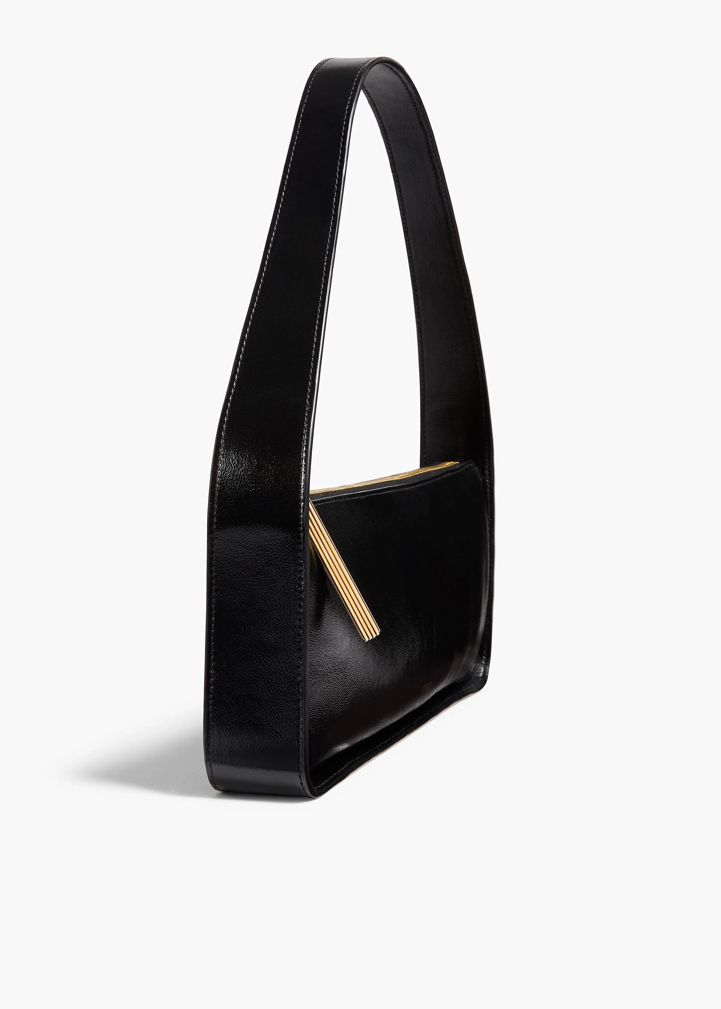 An elegantly elongated zip-top bag softened by the curves of its integrated strap. Art Deco-inspired zipper pull, internal card pocket, and tonal nappa lining.