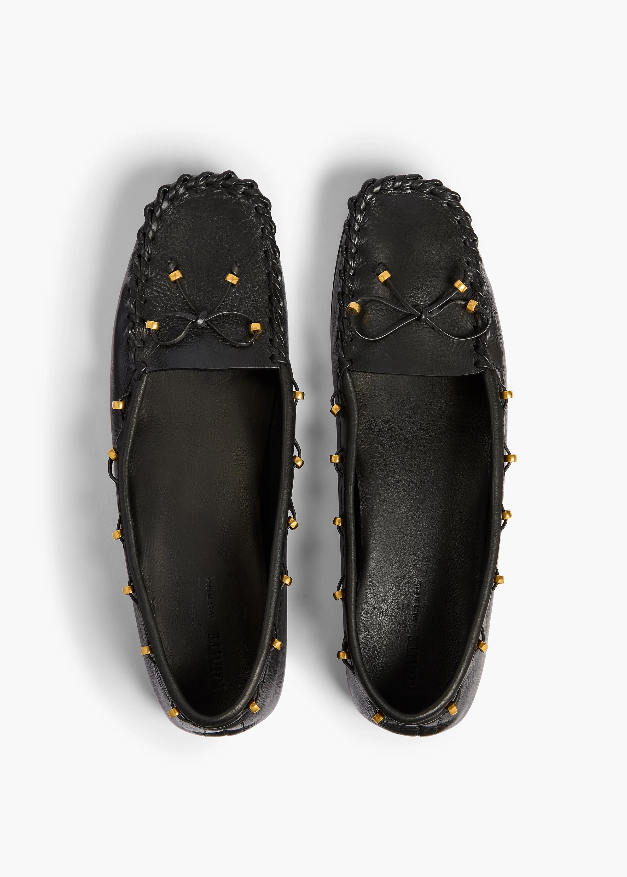 A refined and playful expression of the moccasin in pebbled baby calfskin made soft and lightweight through tumbling. Crafted in Italy with tubular construction for exceptional softness and flexibility. Framed by tonal whipstitching and grommeted lacing hand-threaded with gold beads. Lined in pebbled calfskin. Also available as a heel.