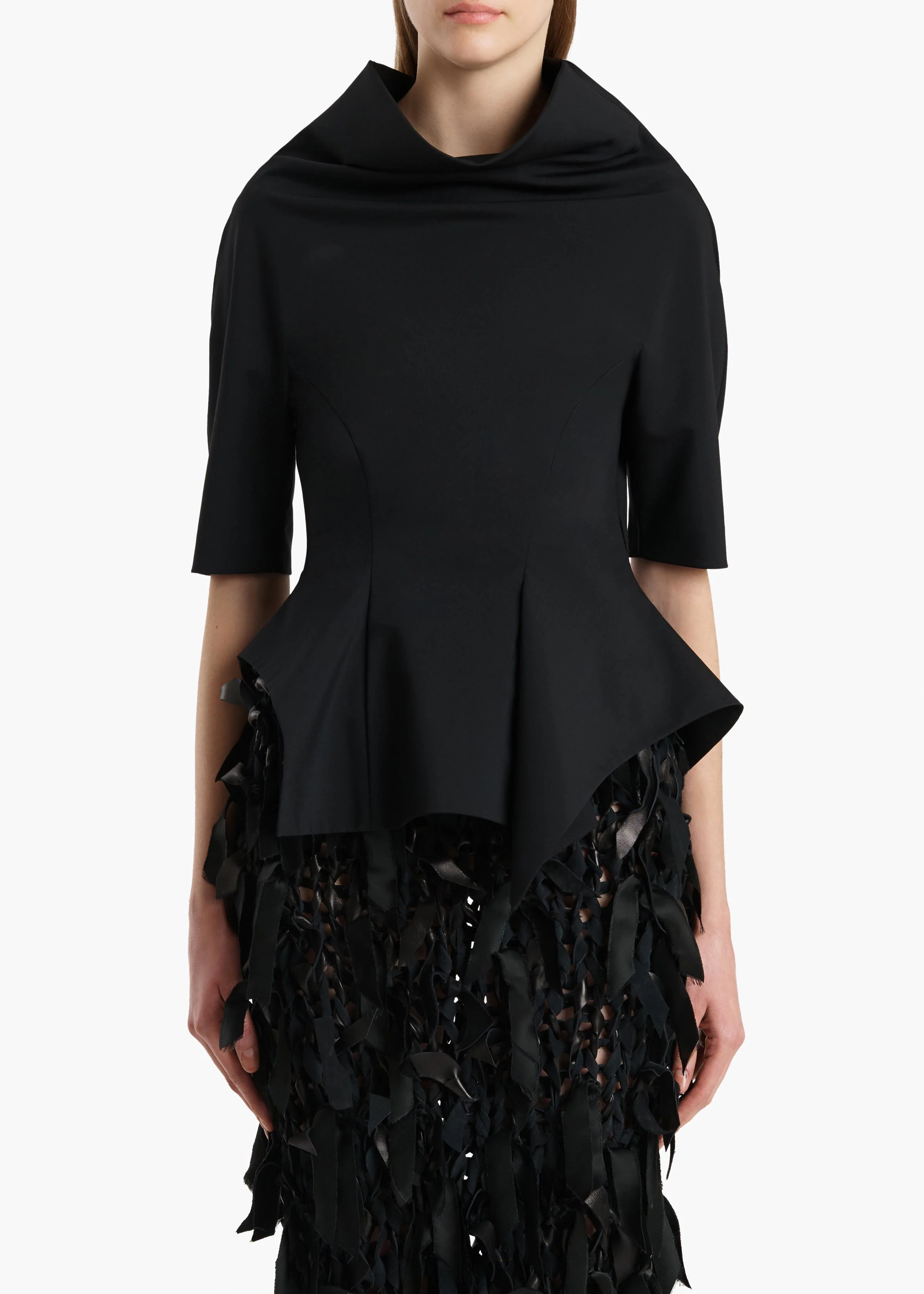 A peplum top of dynamic precision. Made in Italy of lightweight wool suiting selected for its ability to maintain a sharp finish in all seasons. Framed by a draped funnel neckline and sleeves designed to hit just above the elbow, the silhouette is contoured by princess seaming, flaring from the waist into draped volume with a handkerchief hem. Zipper closure at back, where neckline is secured by four buttons. Lined in soft silk habotai.