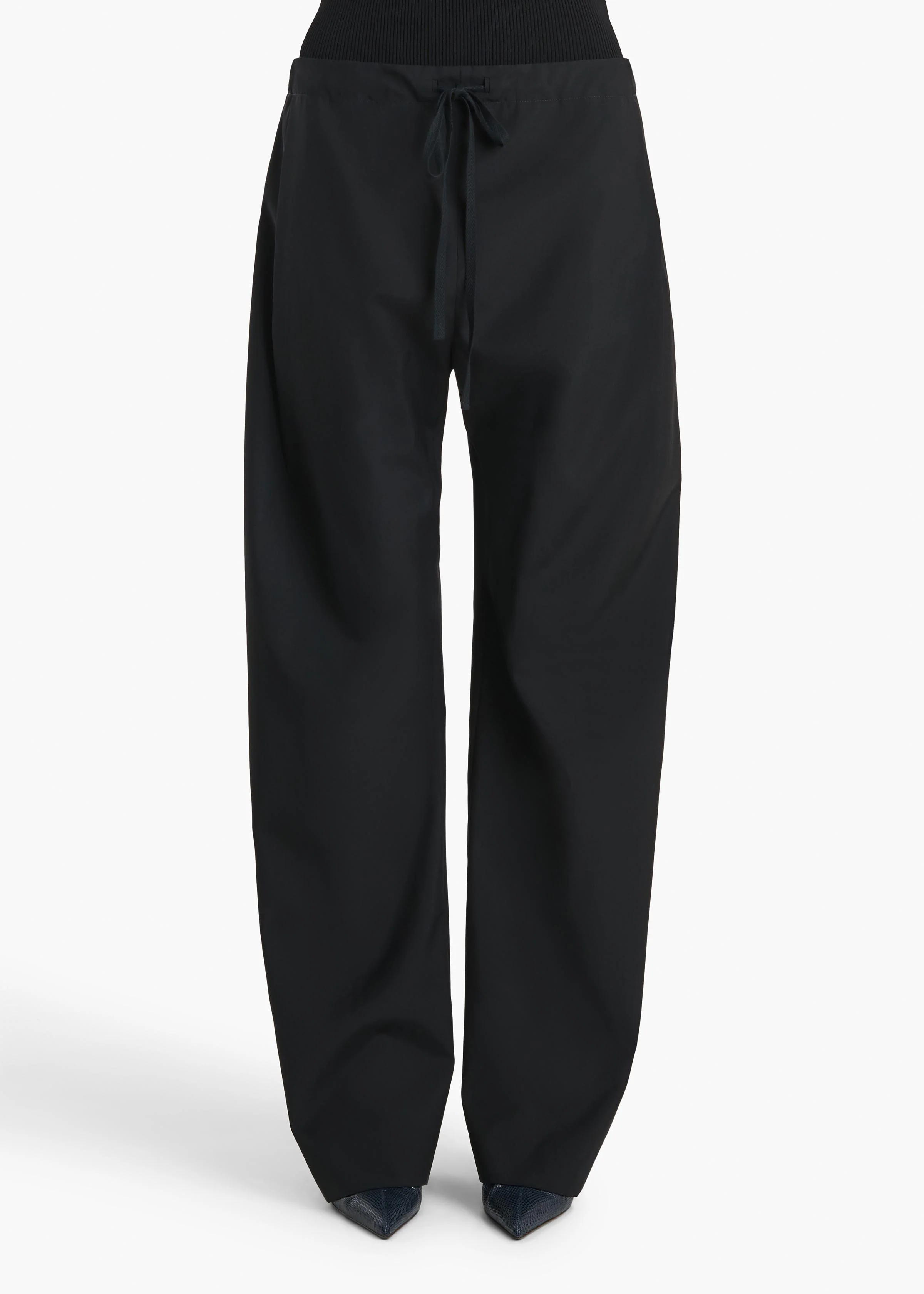 A pull-on pant that balances softness with sophistication. The relaxed, bow-leg silhouette is tailored in lightweight wool suiting selected for its ability to maintain a sleek finish in all seasons. Finished with a concealed pocket and a herringbone grosgrain tie at the elasticated waist.