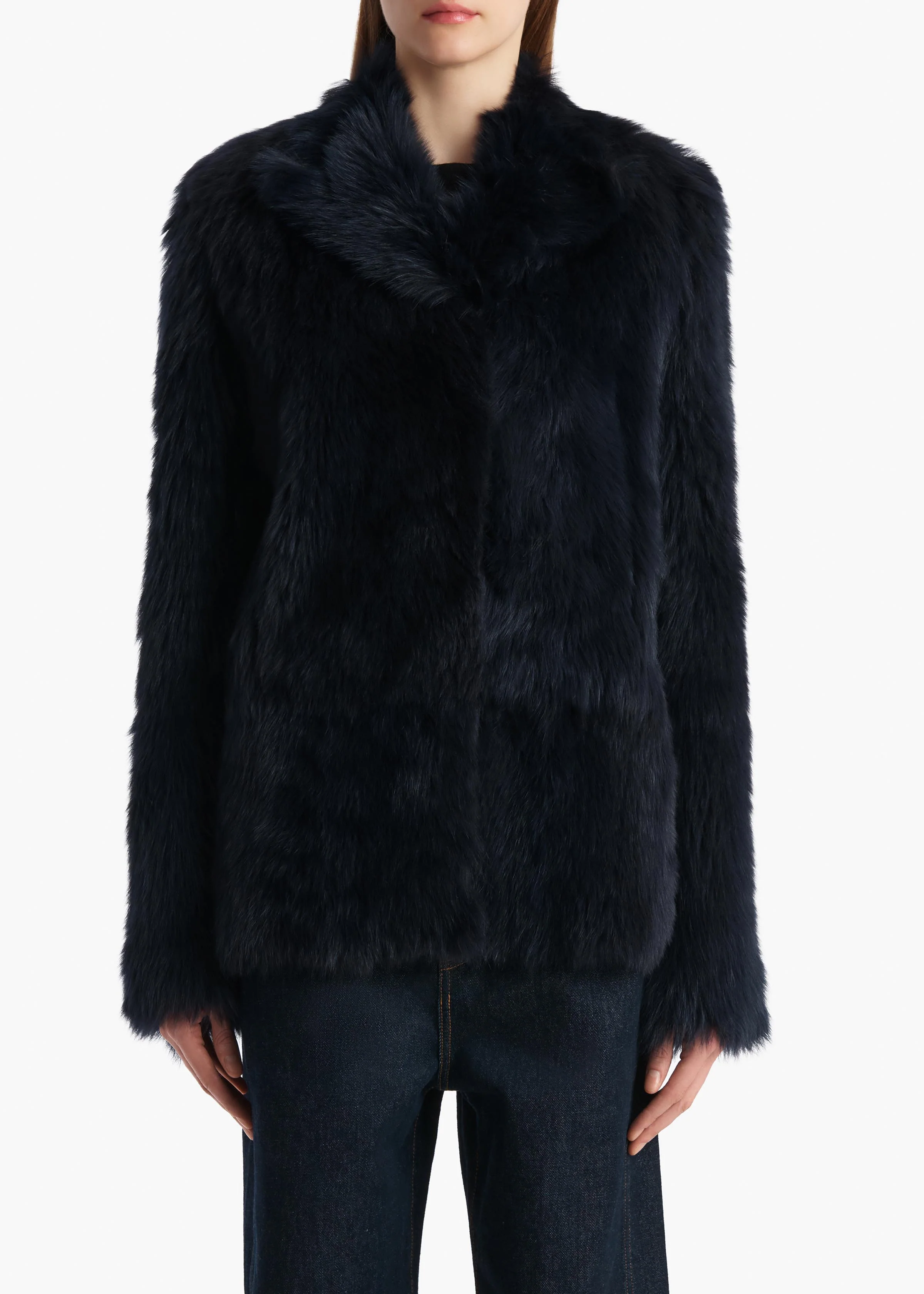 A high-necked jacket in silky-soft Toscana shearling with lambskin lining. With peak lapels, welt pockets, hook-and-eye closure, and internal buttons.
