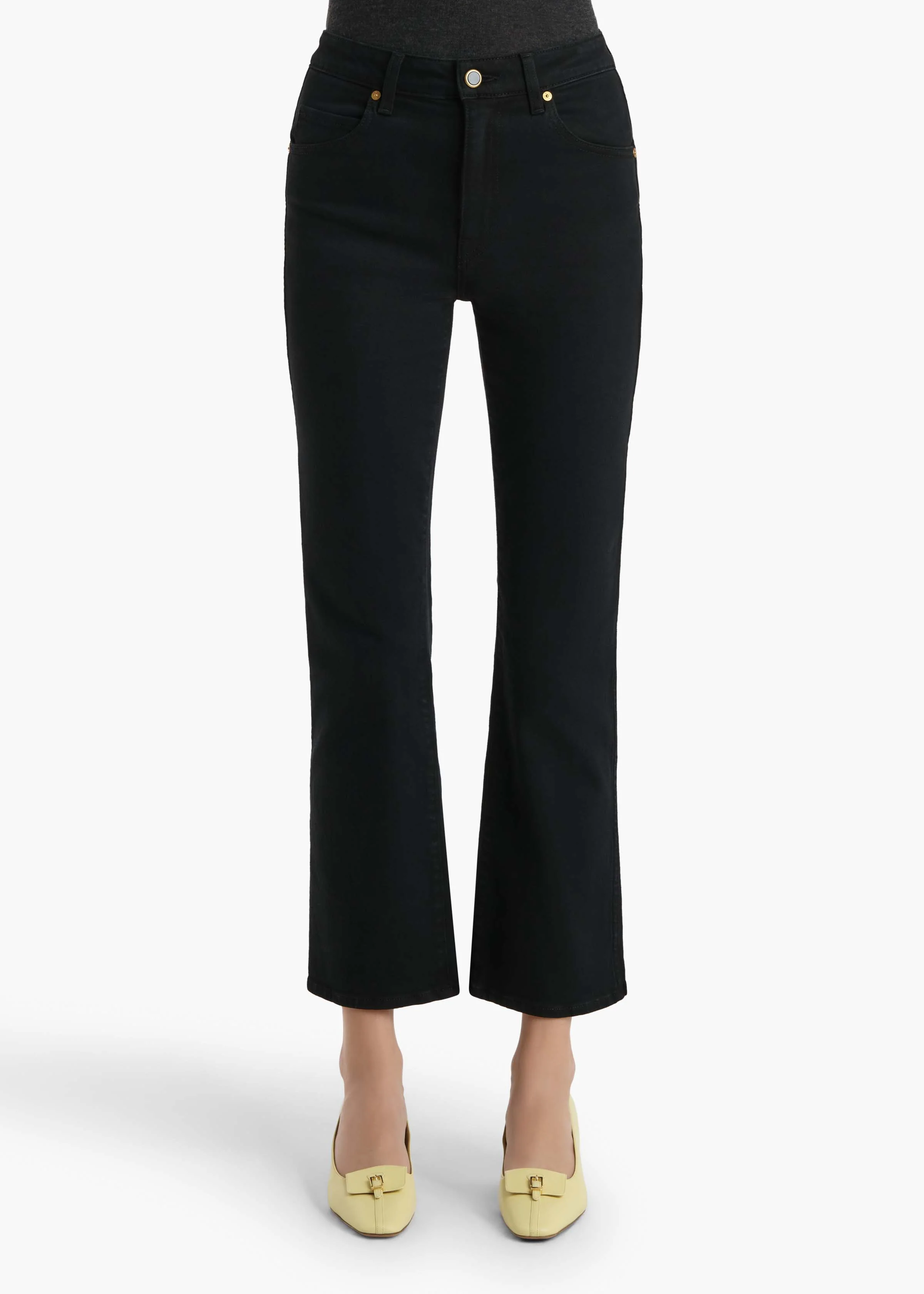 With the hint of a flare accentuating its cropped silhouette, this high-rise style is a fresh interpretation of the classic bootcut, with back patch pockets placed to flatter. Hand-finished with enameled button of antiqued brass.