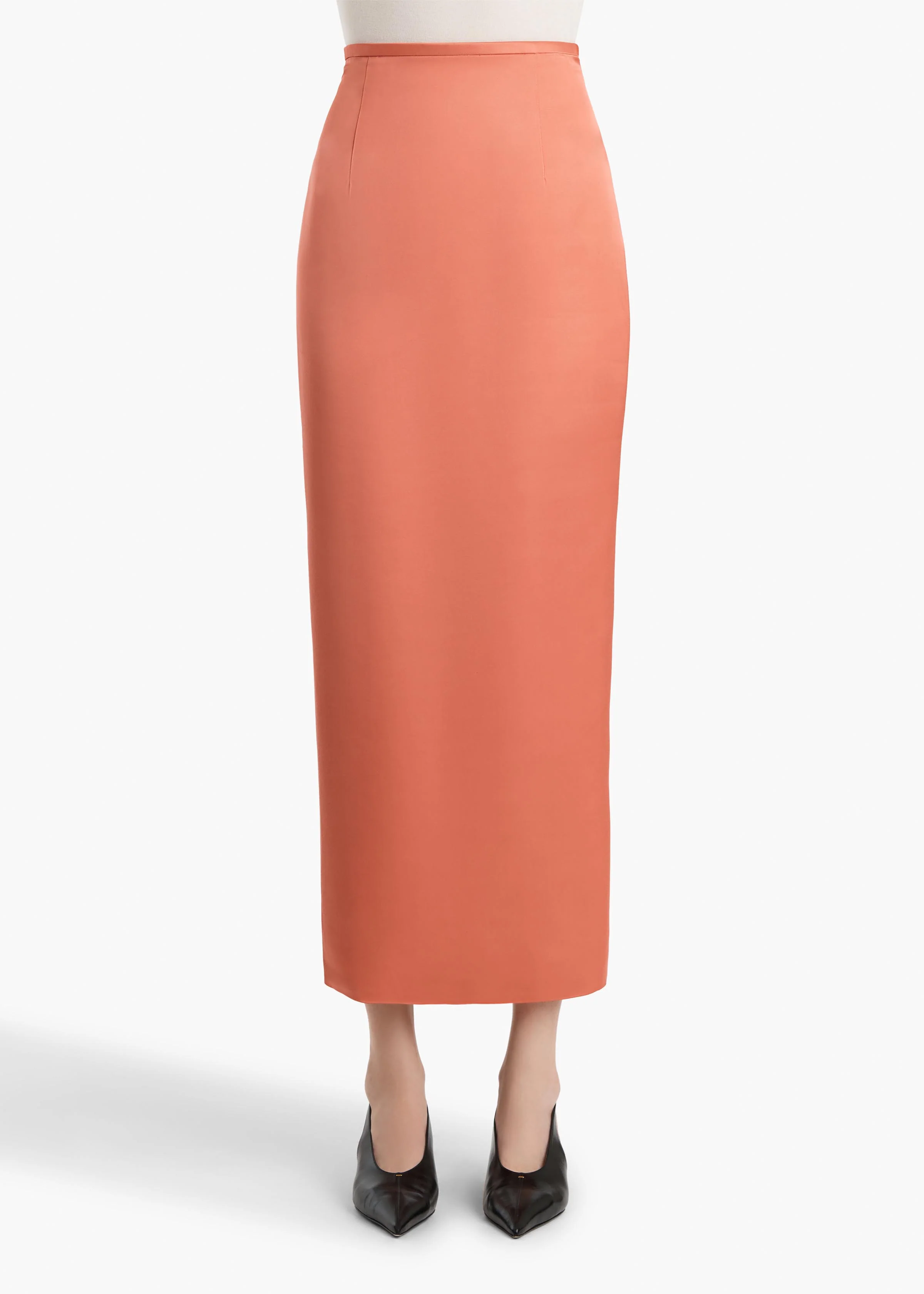 An elongated pencil skirt made in Italy of double-faced satin selected for its dramatic drape and luminous sheen. The tapered silhouette is framed by a contoured waistband and refined darts for a sleek, tailored fit. Back slit allows for ease of movement. Concealed zipper closure at back.